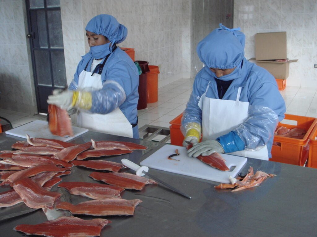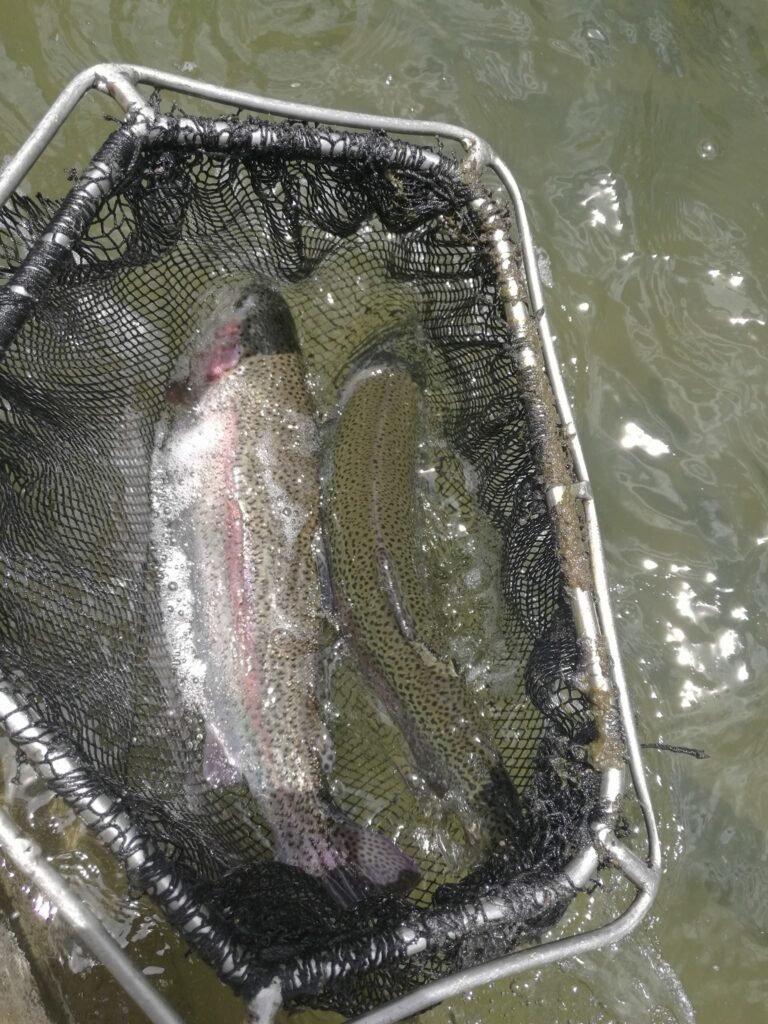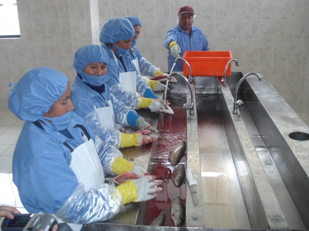 Las truchas adultas se capturan con cuidado de los estanques de engorde, minimizando el estrés para preservar la calidad de la carne. Inmediatamente se transportan vivas a la sala de procesos, donde todo inicia en menos de 30 minutos para evitar cualquier deterioro.